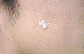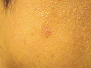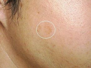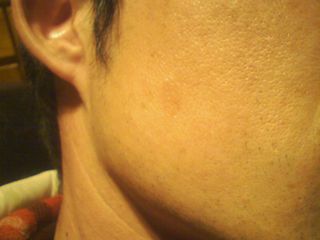 上の画像は2013年2月の右頬下のシミになります。まだ何もしていない一番初期のシミの濃さをしています。ここからこのシミの1回目のクイノール塗布をした最終画像が![]()